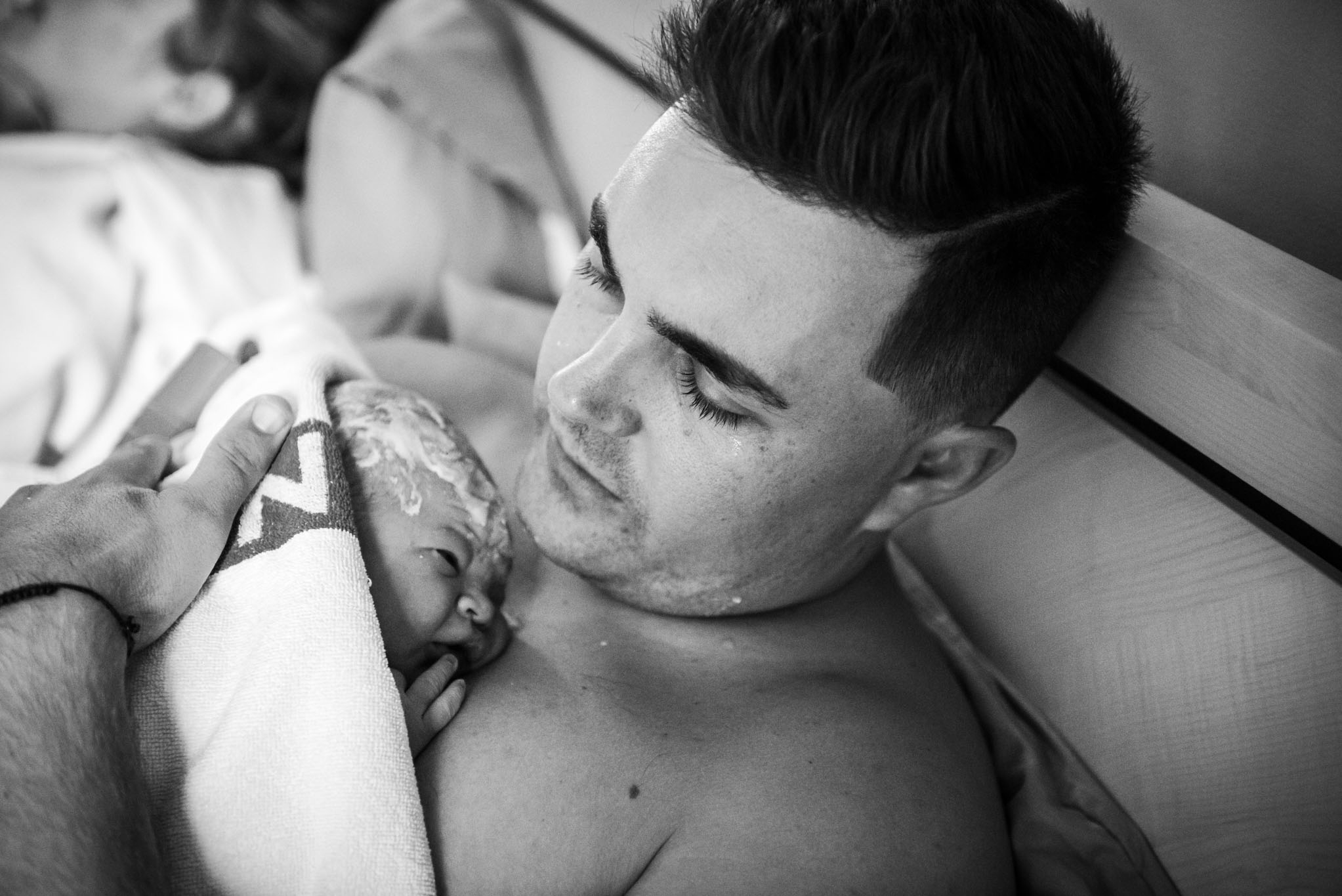 Meanwhile Elisa was lying skin to skin on Heinrich chest, safe and sound. She started rooting and Heinrich gave her to me. She latched immediately with such ease and drank happily. The midwives checked her APGAR and did all the necessary check-ups in such peace, allowing baby and mom to have all the time we needed to bond.
